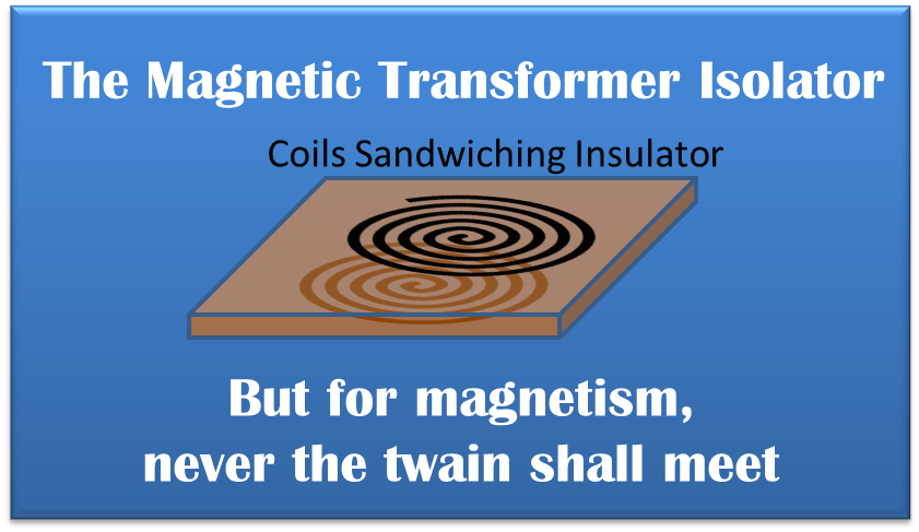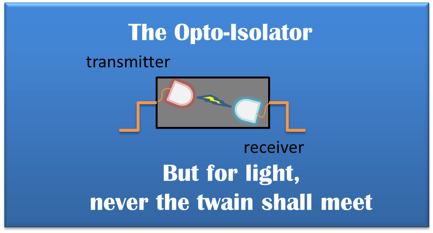 As a kid reading articles in Joe Desposito’s, (scroll down the linked page, he’s there!), Popular Electronics, I often wondered what a circuit isolator was. I was especially curious about opto-isolators. I’d built an optical communications project with an IR diode and a photo-transistor. As far as I could tell an opto-isolator was the essential guts of my project built onto a chip. Because opto-isolators just met the affordability cutoff of my two dollar-a-week allowance, I picked one up at the local parts store and experimented with it. Sure enough, it could serve as an interface between the transmitter and receiver of my little project. The little chip still baffled me though, whereas my original project could transmit across the room, the opto-isolator did the same thing with a somewhat underwhelming range—across the plastic IC package within which it was embedded.