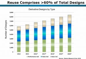 Feldhan next observed that derivate designs represent about 60% of the overall design – which make up the 13,000 design starts mentioned earlier (see Figure 4). Note that the lower green bar, which represents high performance SOCs, is growing because companies are trying to reduce their risk with Performance SOCs by developing derivative designs. Also, there is significant growth in the Value and Basic SOC markets on the top. So while first time designs were just under 5,000 (about 4,900) in 2020, reuse designs will reach nearly 8,400 (or 13,300 – 4,900 = 8,400) by 2020. Even in 2016 reuse designs will total 6,800, which will exceed the number of first time designs for Performance SOCs in 2020. From these numbers, one can see the value of reuse to recoup some of SOC investments and take advantage of the existing design from one’s first time efforts.